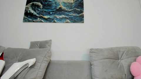annemonalo - Video of an Asian woman with long brown hair in black lingerie, seated on a gray couch, texting on a laptop. Background includes a painting of ocean waves and white high-heeled shoes.
